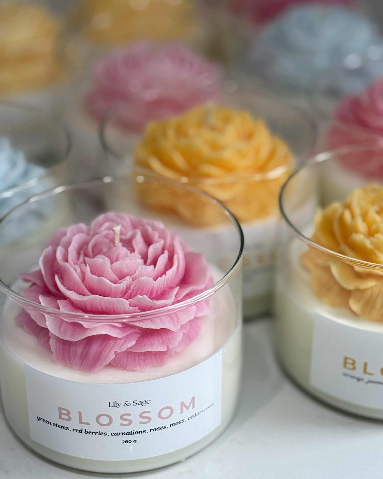 Elevate your space with Pink Blossom, a flower candle that captures the irresistible scent of a fresh flower shop. Green stems, red berries, carnations and roses