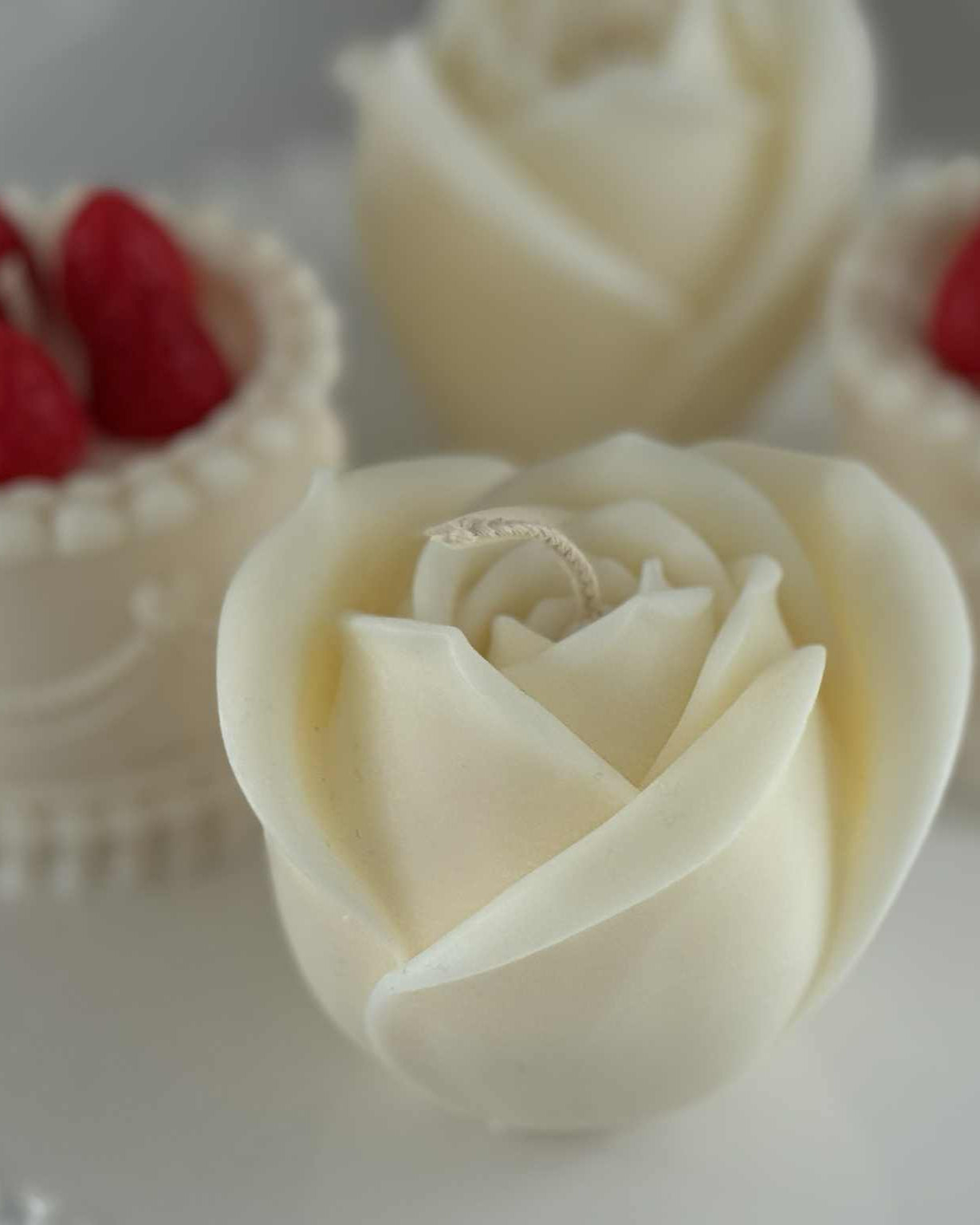 Experience the elegant harmony of our Rose candle, where delicate rose petals meet the subtle sweetness of ripe strawberry and smooth cream